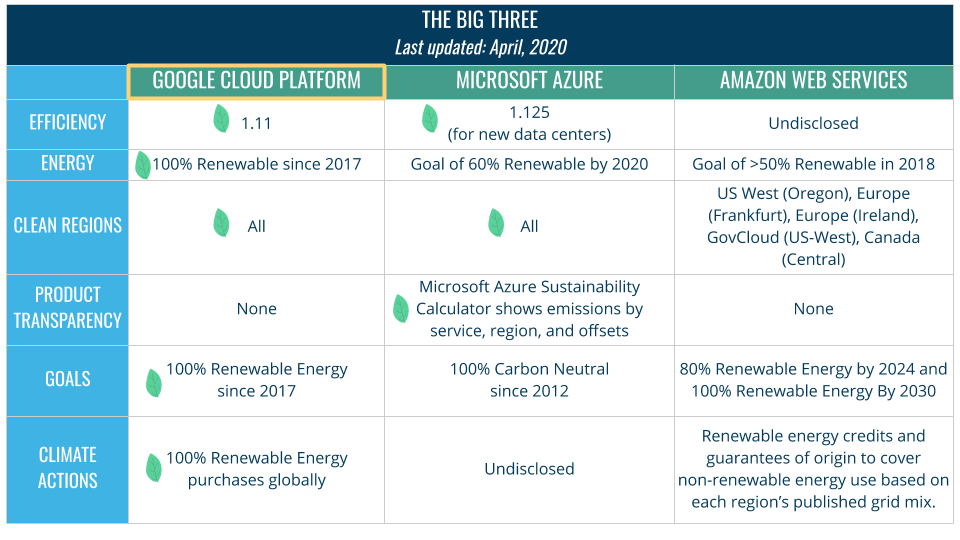 This chart summarizes some of the main climate attributes of the big three providers. For more detailed analysis, including letter grading and analysis of other top providers (inc., Oracle, IBM, Alibaba), check out The State of Data Center Energy Use in 2018 and Greenpeace’s Click Clean online guide.