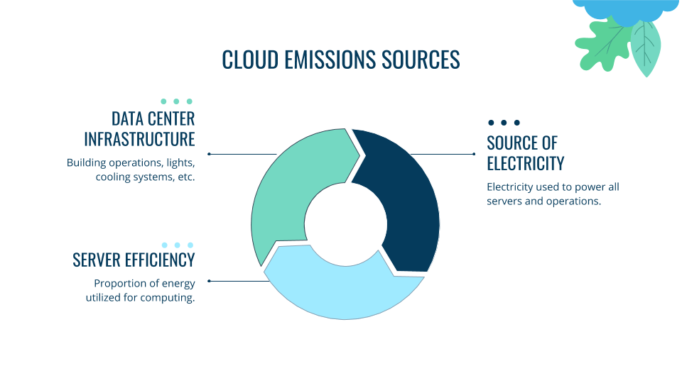 The climate impact of cloud services, measured by emissions produced by energy used, is directly tied to a few key factors: data center infrastructure (e.g., lights, cooling systems), server efficiency, and electricity source.