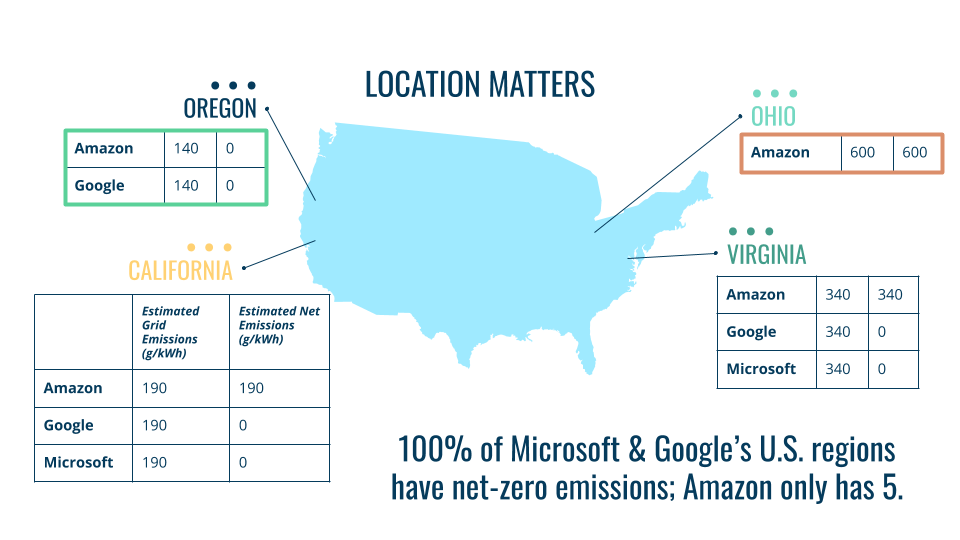 - Oregon is an available region for both Google and Microsoft and is one of the cleanest regions overall, both in terms of actual grid emissions and net emissions; and