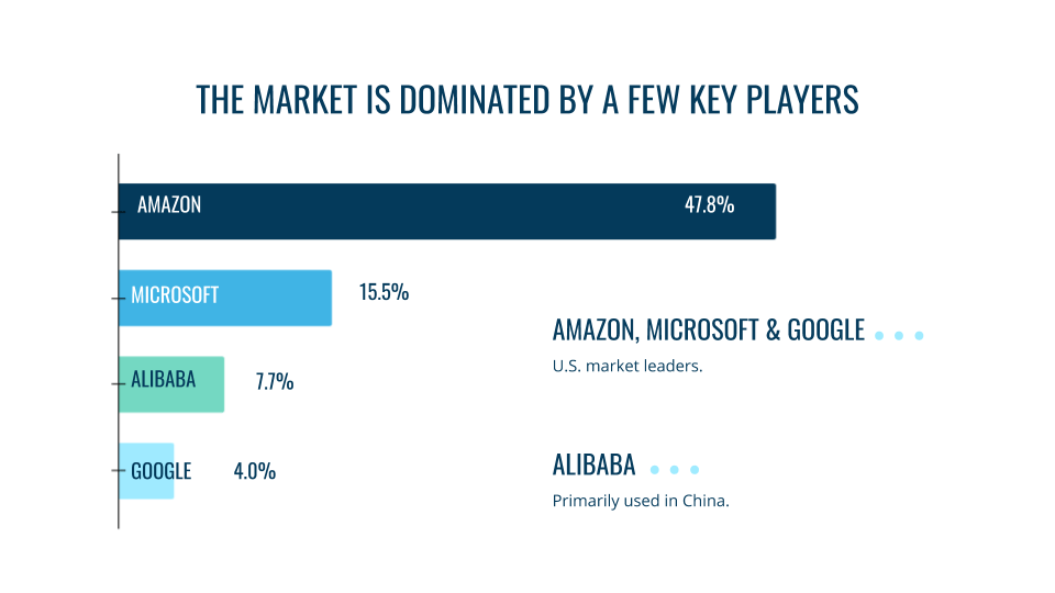 Cloud computing is also a unique market, with fast growth across the board but significant consolidation in a few large providers. Globally, the top four providers (Google’s Cloud Platform, Amazon Web Services, Microsoft Azure, Alibaba Cloud) account for 75 percent of the market, with Alibaba dominant in China.